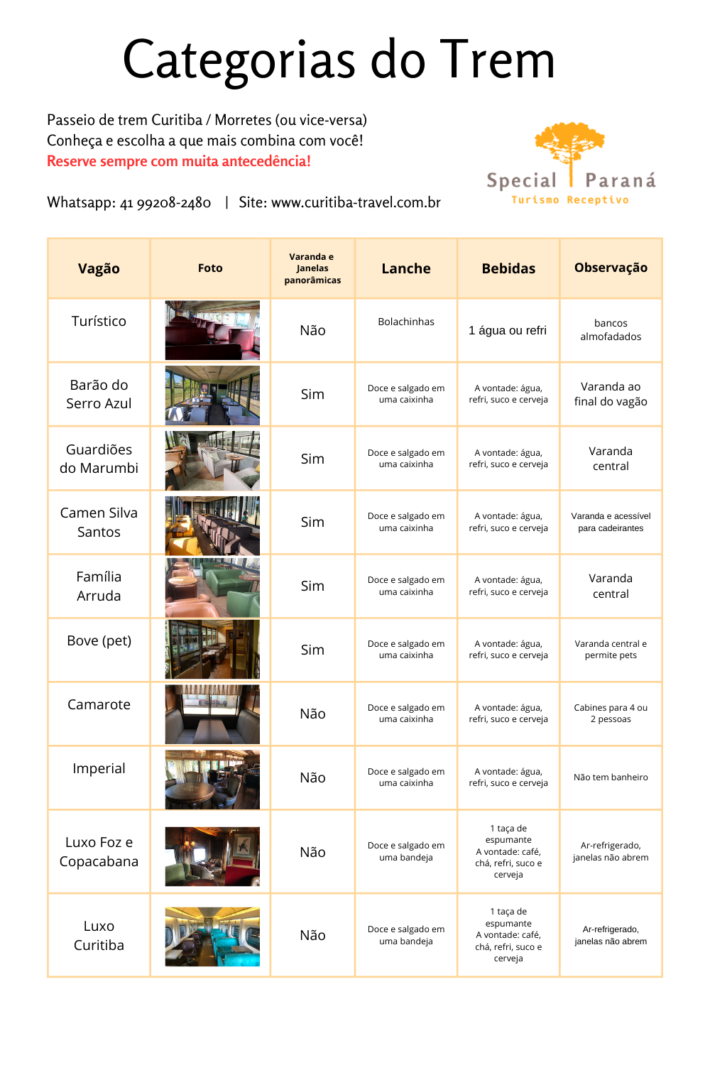 Trem de Luxo: única opção com ar-refrigerado e que não abre as janelas. São 3 vagões com decoração diferente, dois deles mais clássicos (Copacabana e Foz) e outro mais moderno (Curitiba). O serviço de bordo é mais completo,  com lanche, 1 taça de espumante de boas vindas e bebidas (café, chá, suco, água, refri e cerveja à vontade).